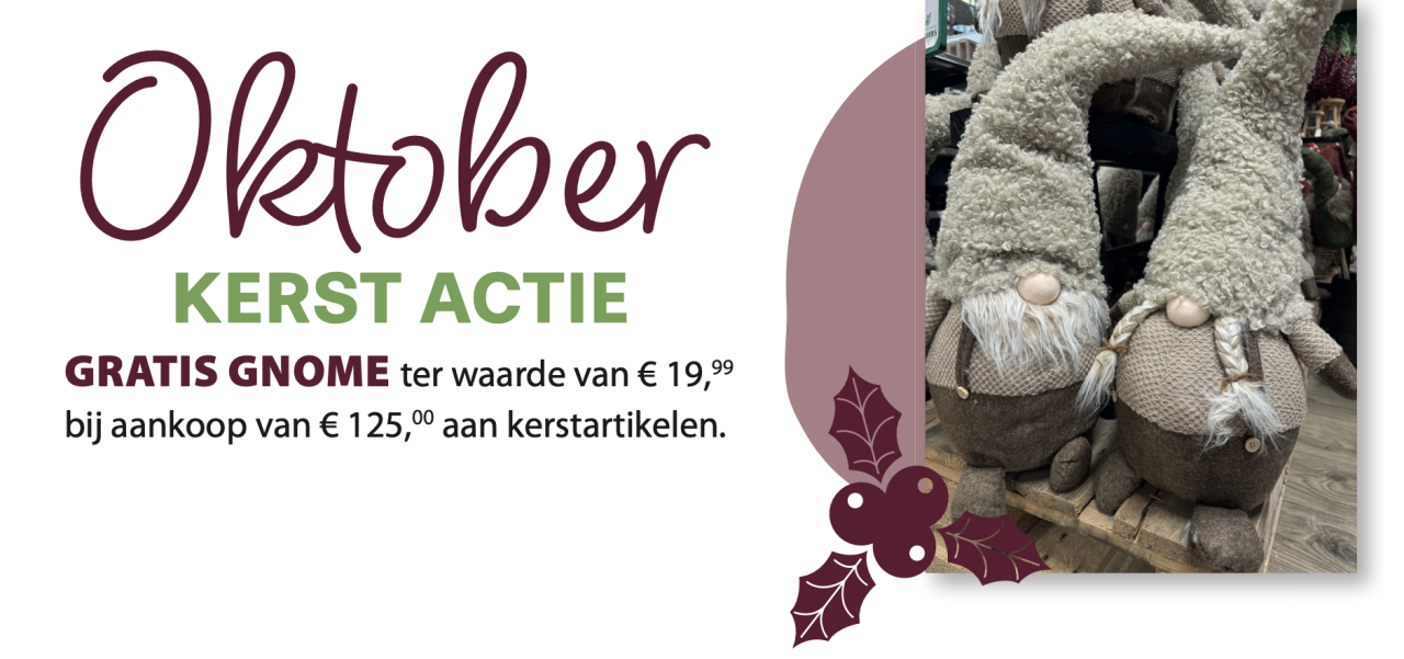- OKTOBER ACTIE | Alleen in de winkel: Gratis gnome ter waarde van €19.99 bij aankoop van €125 aan kerstartikelen