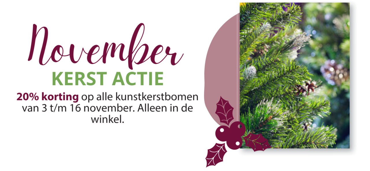 - NOVEMBER ACTIE | Alleen in de winkel: 20% korting op alle kunstkerstbomen